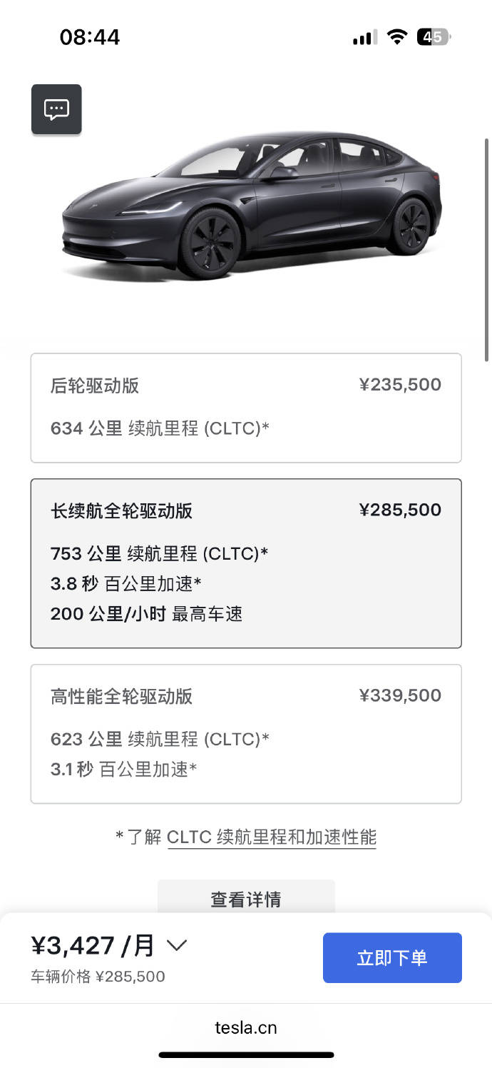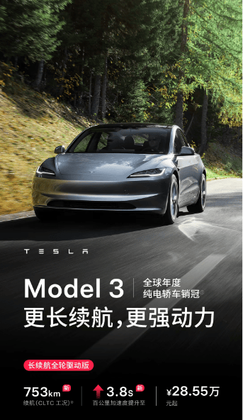 特斯拉中国官网显示,目前Model 3长续航版的售价已调整至28.55万元。Model 3长续航全轮驱动版CLTC续航增至753公里,百公里加速提升至3.8秒。此前价格为27.55万元。